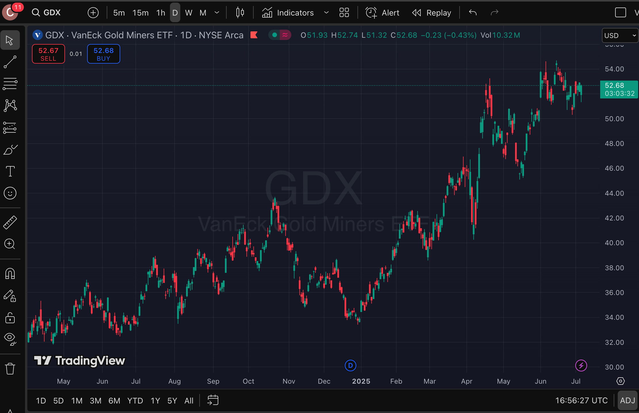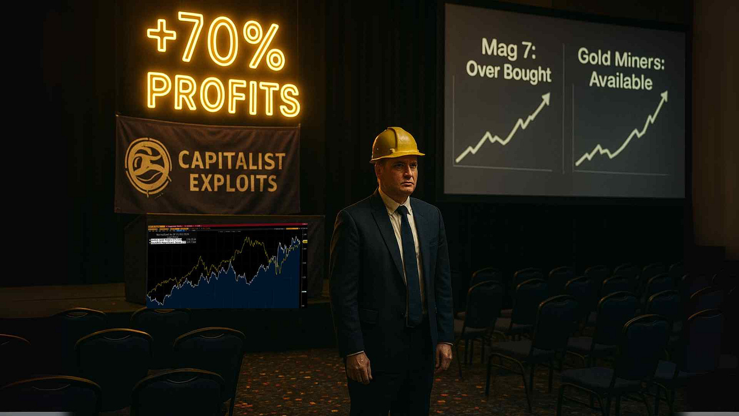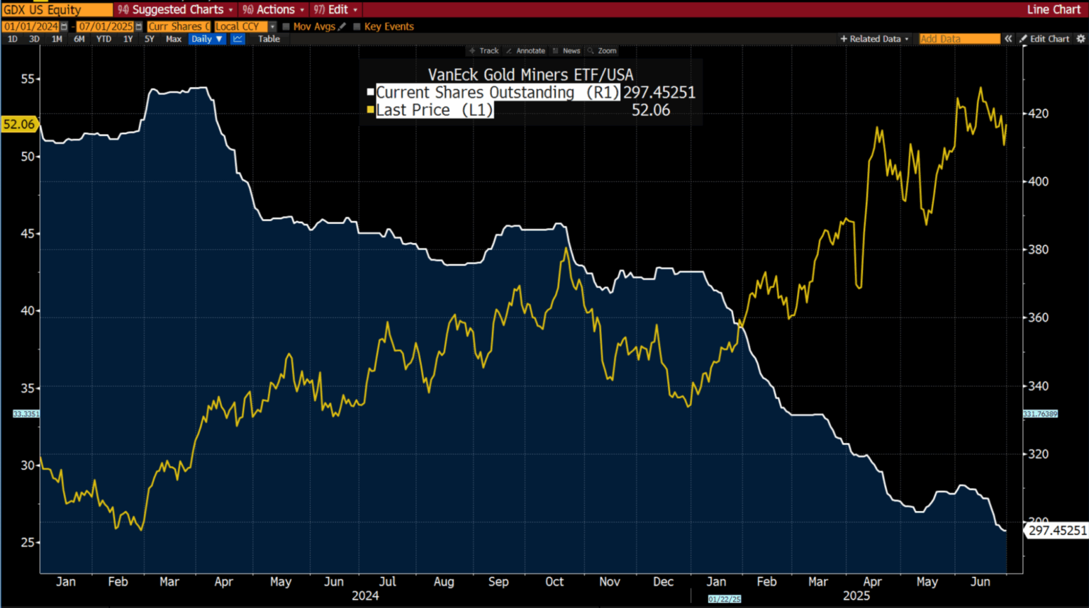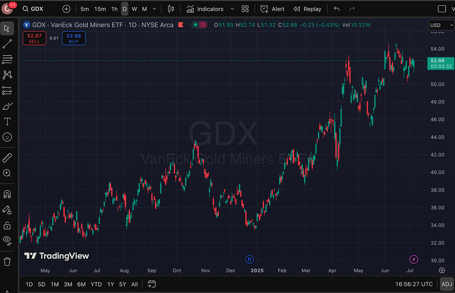 Just like the Mag 7, gold miners (tracked by the VanEck Gold Miners ETF, GDX) are up ~70% since early 2024.