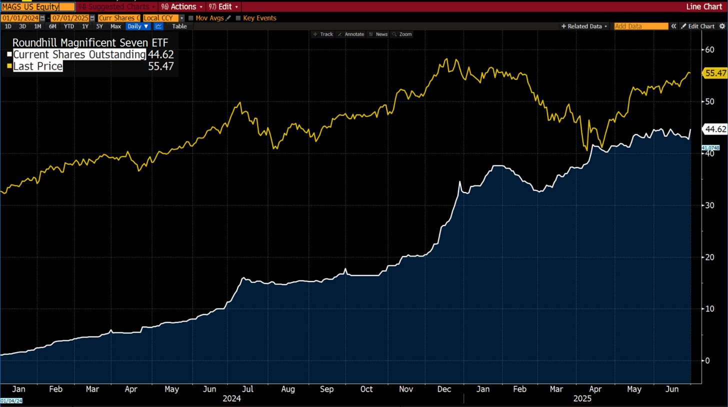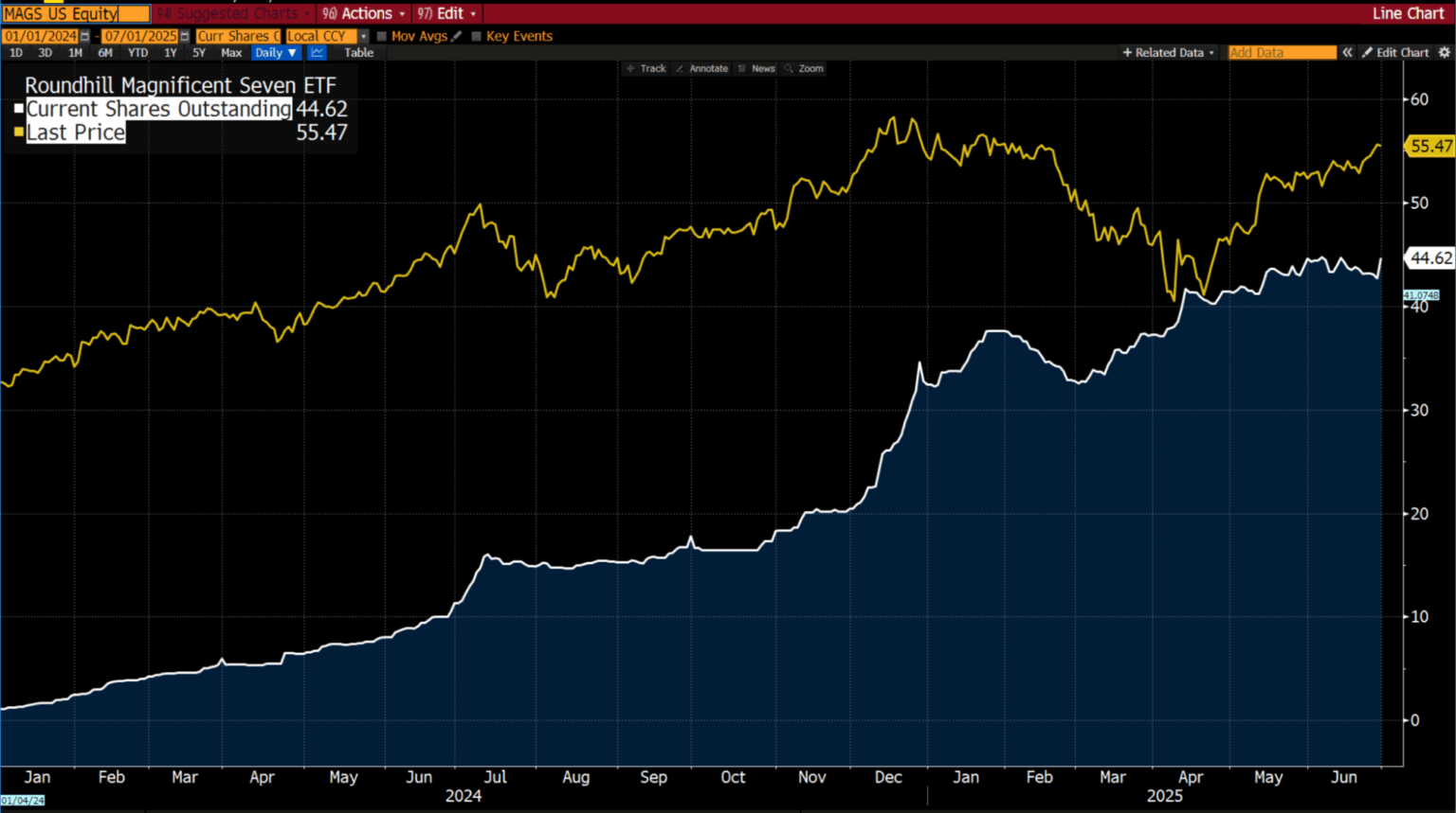 So it’s no surprise that investors are piling into the MAGS like it’s a lifeboat made of pure gold. Price is up. Shares outstanding are surging. Everyone wants a piece.