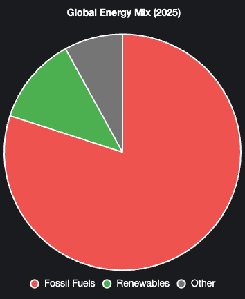 While renewables like wind and solar are growing, they still represent a small fraction of the global energy mix.