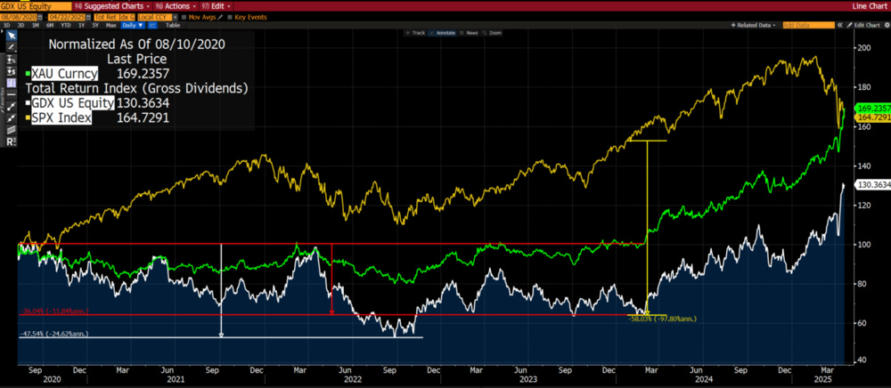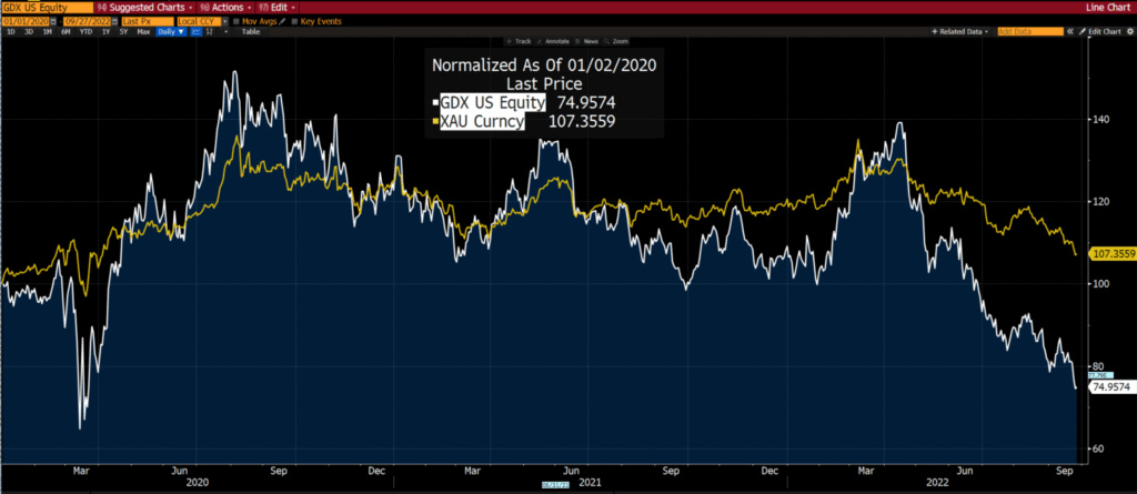 Consider that from September 2020 to September 2022, gold miners were down about 50% and gold was down 20%.