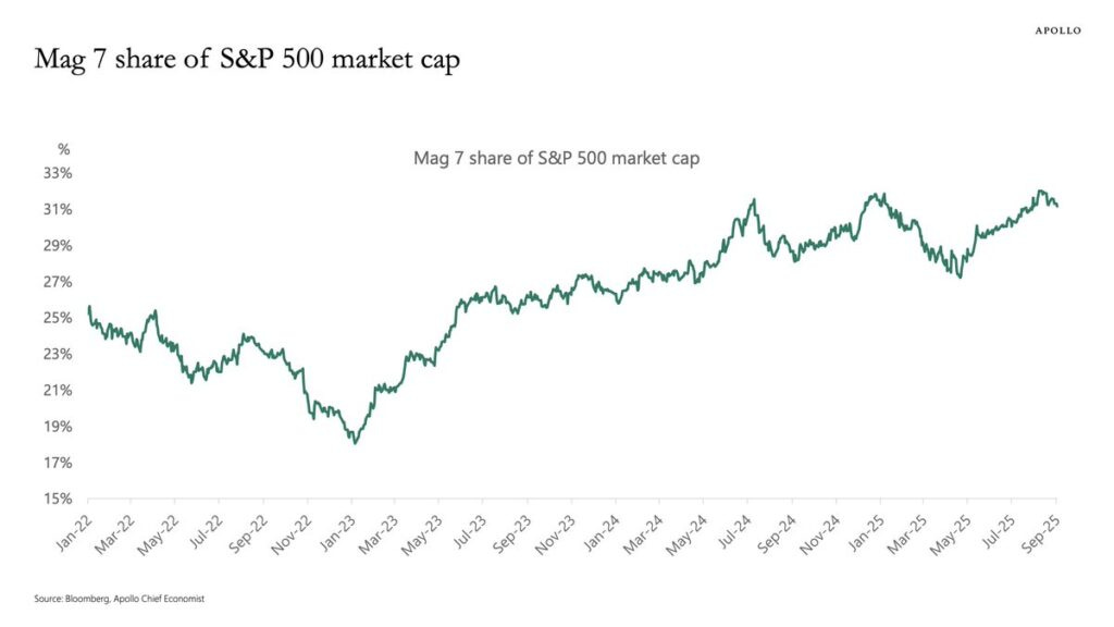 The Magnificent 7 (Apple, Microsoft, Amazon, Meta, Nvidia, and Tesla) account for approximately 32% of the S&P 500’s market capitalization.