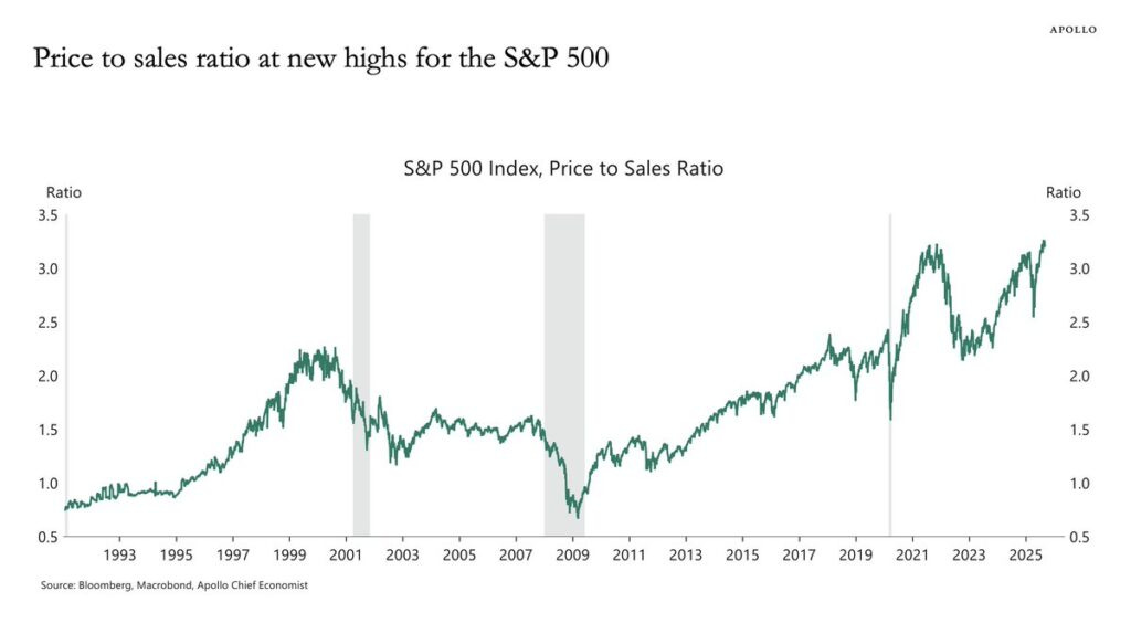 Since 2021, 55% of S&P 500 returns have come from just 10 stocks. And the price-to-sales ratio has now hit an all-time high of 3.3x.