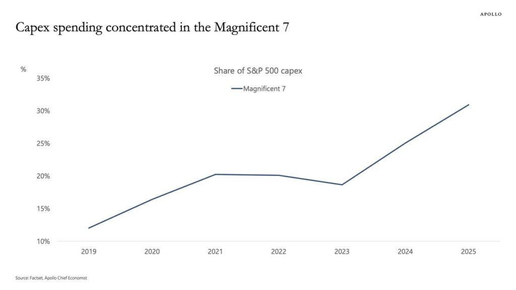 Approximately 31% of the S&P 500’s capital expenditure (capex) spend now comes from the Magnificent 7.