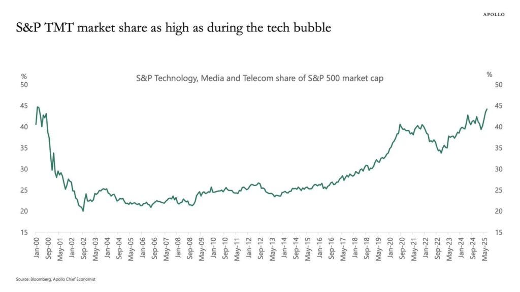 The S&P TMT market share has reached the same concentration as the dot-com bubble at 45%.