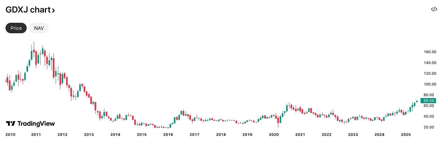 The GDXJ dips into the riskier world of junior miners…those wildcatting for ounces in places with more dirt and rocks than rules.