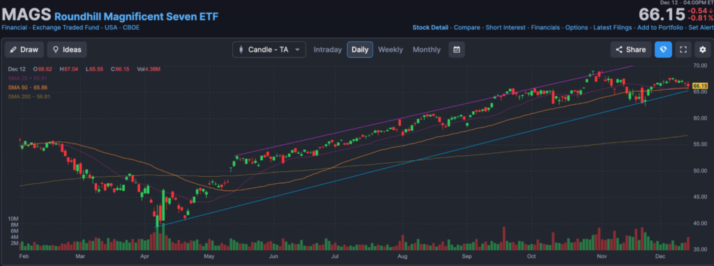 Talking of the steam running out… the Magnificent 7 look to be faltering. Here’s the Mag 7 ETF. It looks like it is topping out.