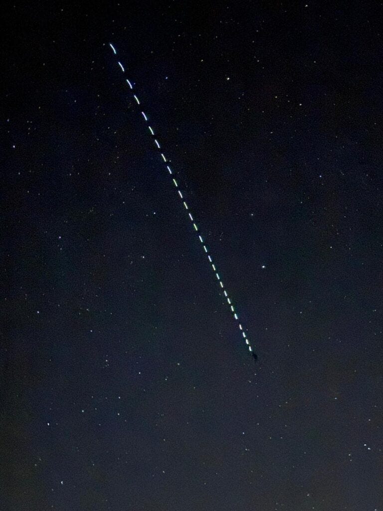 BTW, I (Brad) saw a bizarre occurrence over the skies of Victoria, Australia on 9 December at about 10 p.m. — a line of shining objects moving quite quickly. No, it wasn’t a close encounter. Rather a string of SpaceX satellites, which had just been launched from a rocket (I presume). This photo was taken from my iPhone.