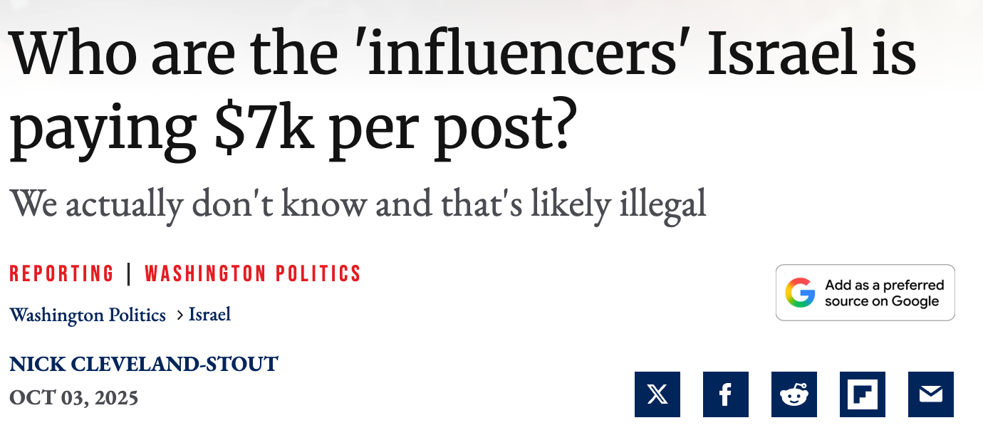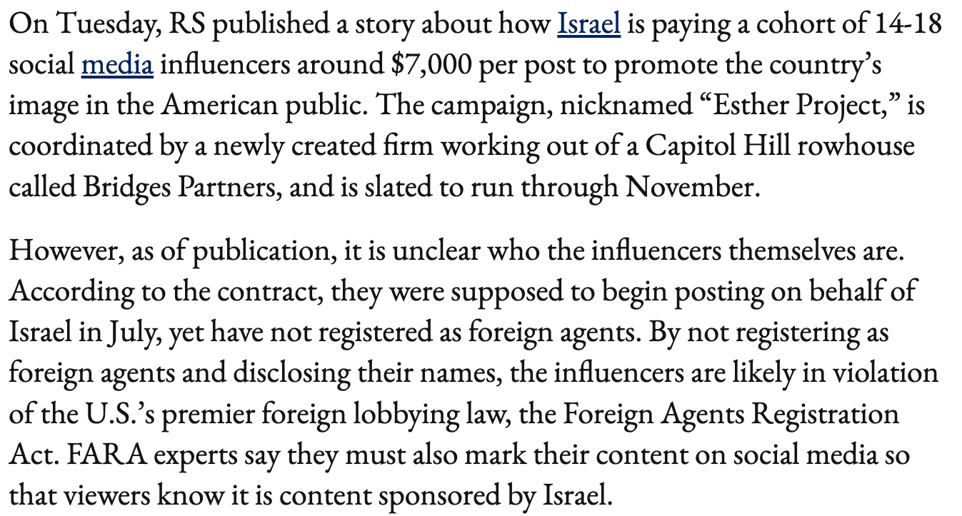 That’s not a metaphor. The Israeli Foreign Ministry allocated a budget of $900,000 through a firm called Bridges Partners, paying 14 to 18 social media influencers up to $7,000 per post under a campaign code-named the Esther Project. Registered under FARA...the Foreign Agents Registration Act...which means it’s all documented. You just have to bother looking.
