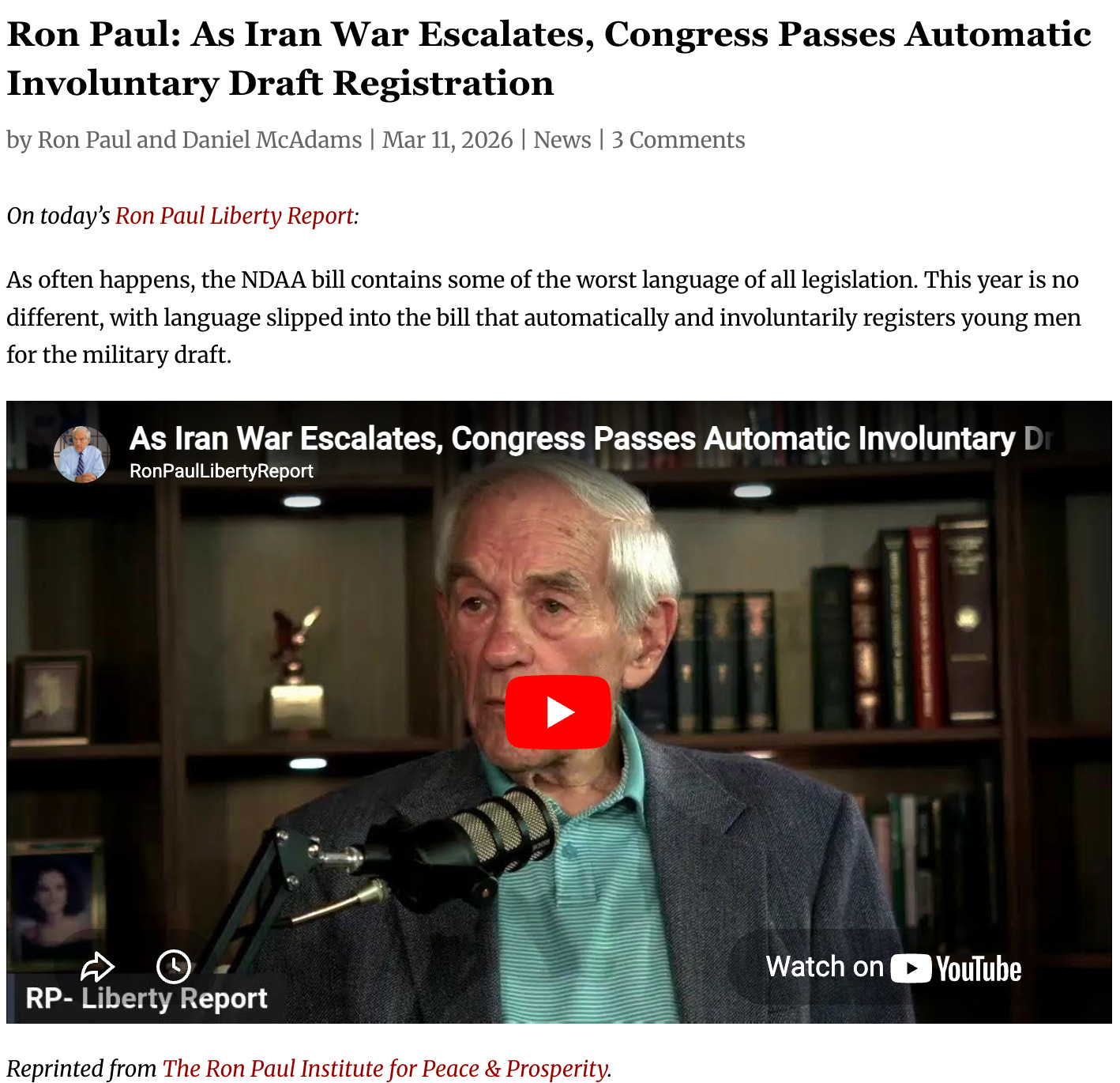 Consider what’s quietly sitting inside the FY2026 National Defense Authorization Act...language embedded in Section 535 that automatically and involuntarily registers young men for the Selective Service using federal databases. No opt-in. No consent. The system goes fully operational December 18, 2026.