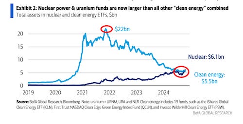 And not only that, for the first ever, the amount of money invested in nuclear/uranium funds now exceeds that of clean energy funds.