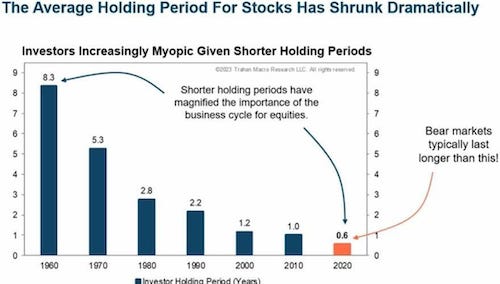 We shared this chart in the Insider Newsletter a few weeks ago, and it perfectly demonstrates out point — the average holding period in the stock market shrunk from 8.3 years in the 1960’s to just 7 months today.