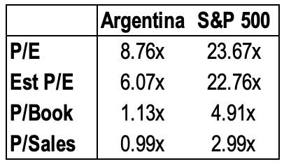 One other thing worth pointing out is that despite this impressive performance so far, Argentinian stocks are still cheap as chips. As a quick comparison, here’s how they stack up against the S&P 500.