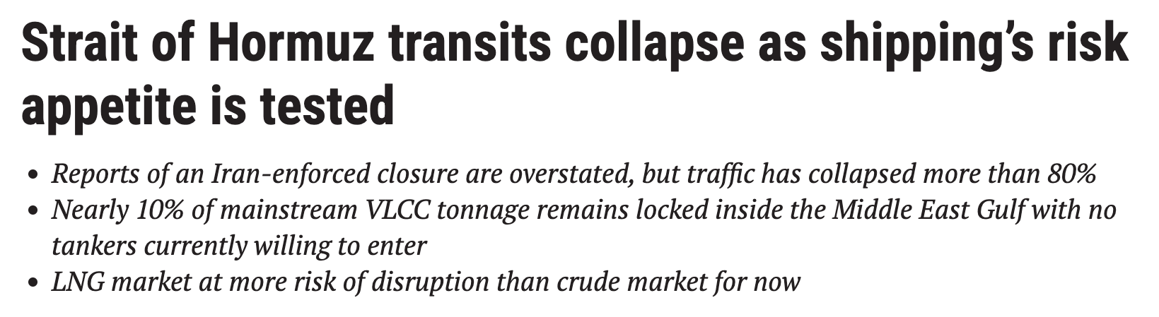 The moment the conflict broke out, transits through the crucial chokepoint collapsed 81%. Not because anyone mined the channel. Not because the IRGC physically blocked the waterway. Because the International Group of P&I Clubs...the insurance system that covers 90% of the world’s ocean-going tonnage...issued cancellation notices for war risk coverage in the Persian Gulf, the Gulf of Oman, and all Iranian territorial waters. Within 72 hours.