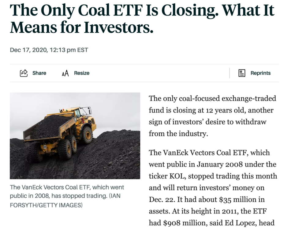 Well done! The closing down of the VanEck Vectors Coal ETF (KOL) almost “bottom ticked” the end of a 10-year bear market in December 2020.