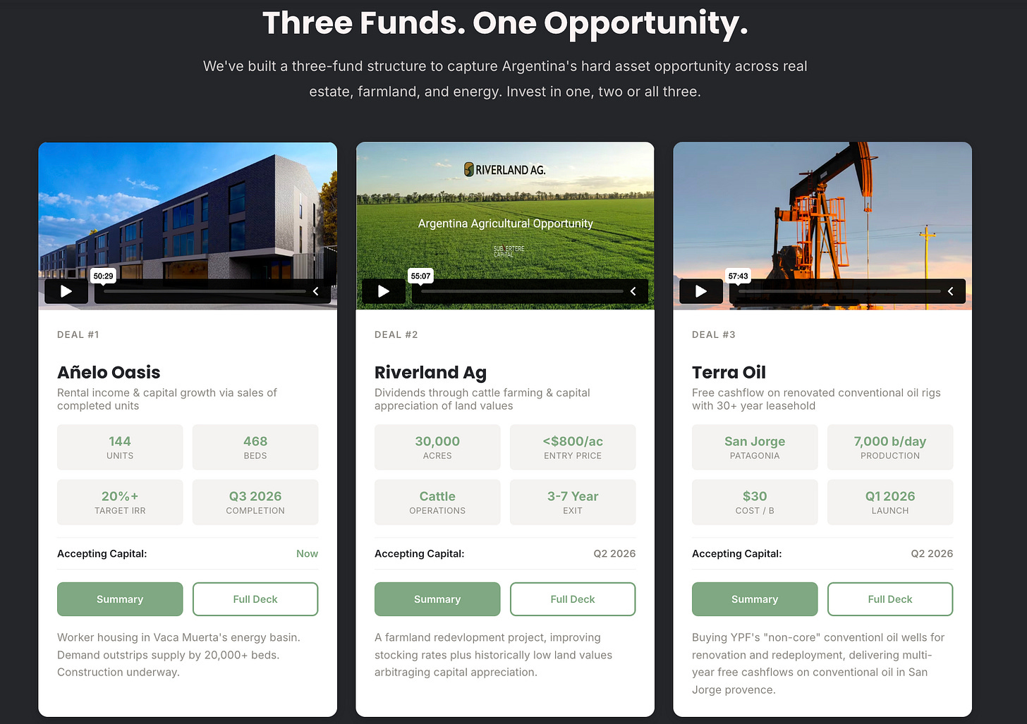 Digging into the private equity space in Argentina, we’ve built a three-fund structure to capture the country’s hard asset opportunity across real estate, farmland, and energy. Invest in one, two… or all three.