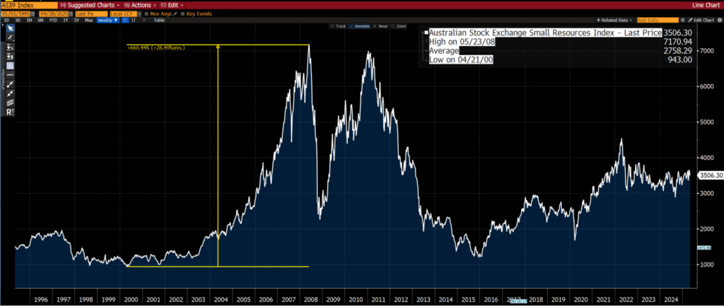 True bull markets in resource stocks are “enlightening.” They tend to surprise everyone in terms of magnitude. Just look at the move in the ASX Small Resources Index from 2000 to 2008 — almost 700%.